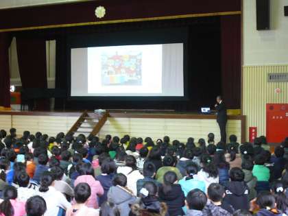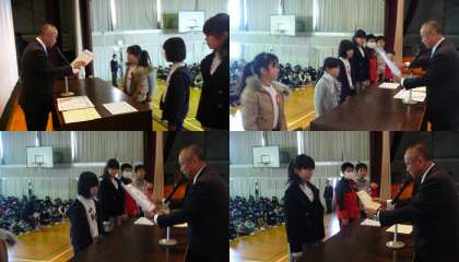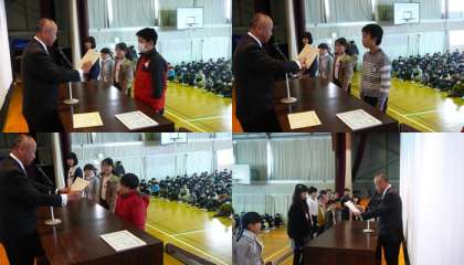 朝会で、校長先生から、北城小学校の出来事についてのお話がありました。その後、表彰が行われました。