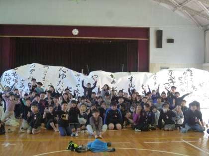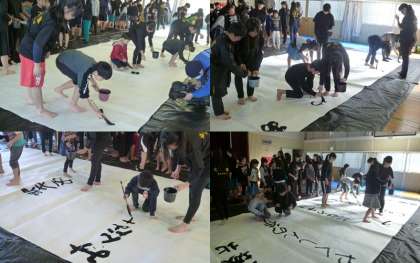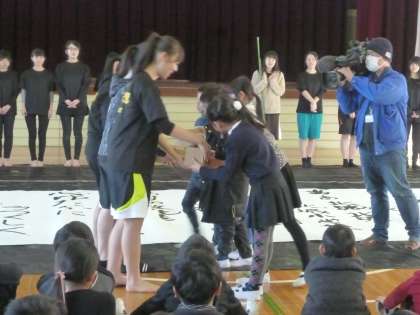愛知県立春日井商業高等学校の書道部の皆さんを迎えて、本校の体育館でパフォーマンスを披露していただきました。その後、3年生が高校生の皆さんに指導を受けながら、北城小学校の校歌を書き上げました。