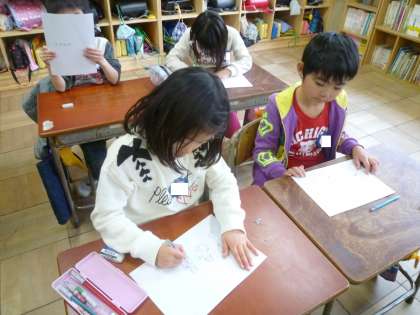 1の2は、新1年生に向けて、メッセージや絵をかいていました。
