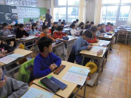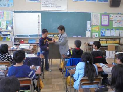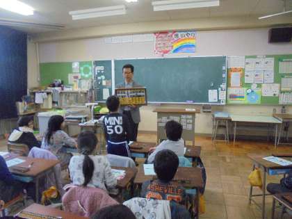 3月9日(金) 1・2時間目に3年生の各教室でそろばん教室を行いました。講師の先生の話を聞いて、そろばんの練習をしました。
