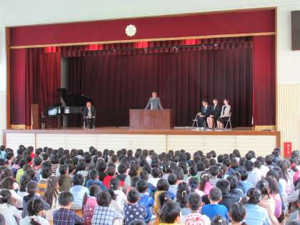 全校児童が緊張の中体育館に入り、新しく北城小学校へ赴任してみえた先生方の挨拶を聞きました。その後、児童が最も楽しみにしている担任発表がありました。