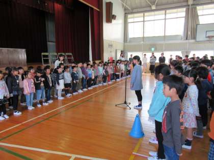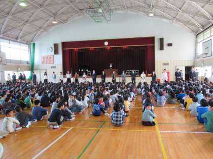 対面式では、北城小学校の仲間入りした1年生101名が、「よろしくお願いします」と在校生に向かって呼びかけました。
