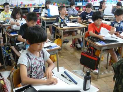 3の2は、書道の紙や墨や筆の使い方や片づけ方を聞いていました。
