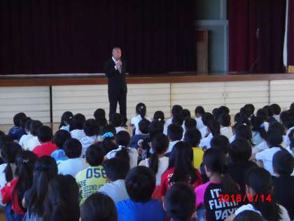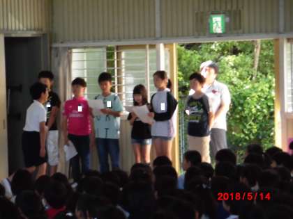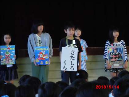 朝会 図書委員会発表 公開日 2018/05/14 更新日 2018/05/14 学校行事 朝会で、校長先生が読書の話をされました。その後、図書委員による図書室での本の借り方・返し方の発表がありました。手作りの小道具を使ってとても分かりやすい発表をしました。