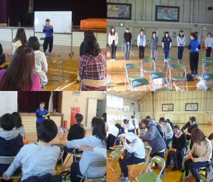 ふれあい教育セミナーで、講師に榎本加代子さんをお迎えして「シナプソロジー&ひめトレ」を行いました。同時に2種類のことを行ったり、身体を軽く触ることで、脳に良い刺激が伝わることや身体が軽くなっていくそうです。失敗することこそ脳を刺激すると言われ、皆さんから笑い声が沸き起こっていました。