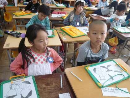 1の2は、クラスの子ども達が描いた絵の良いところをカードに書いていました。
