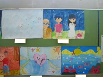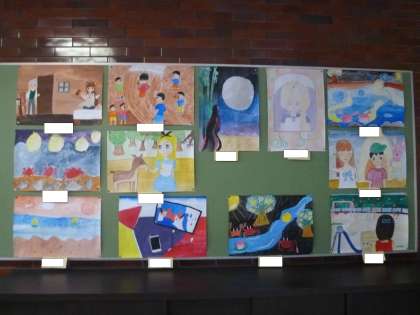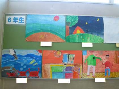 6年生の掲示板には、読書感想画が貼られています。様々な本を読んで、描いています。