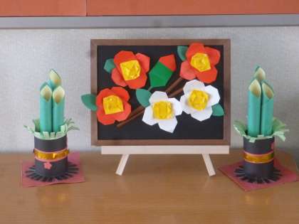 相談室の壁に貼ってある掲示物が素敵です。折り紙で作ってある門松などもすべて手作りです。