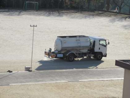 放課後、運動場に防塵・凍結防止のための塩化カルシウムを撒いていただきました。