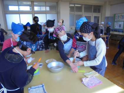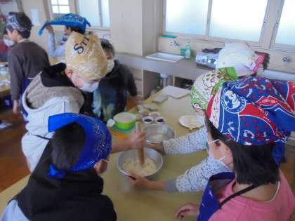 5年生が、総合的な学習の時間に田植えや稲刈りをした後、営農組合の皆さんからいただいたうるち米を使って、五平餅づくりをしました。