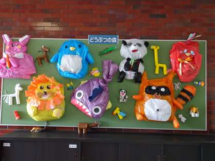 職員昇降口に5組・6組の児童の作品が飾られています。けやきの子作品展でも展示されました。