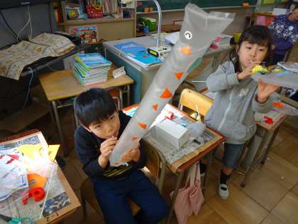 授業の様子「吹いて遊ぶ」