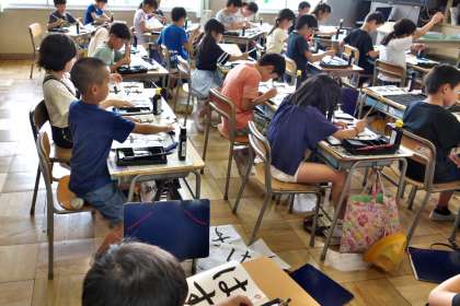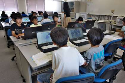 授業の様子(4年生) 公開日 2019/06/26 更新日 2019/06/26 4年 4年生の授業です。社会の授業では、北陸地方の県名を積極的に発言していました。書写の授業では「はす」の字を力強く書いていました。また、コンピュータ室での算数の授業では、図形を敷き詰めるソフトを使って台形を学習していました。