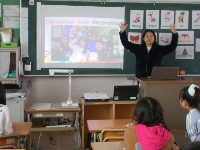 今日の、ALTべべ先生との英語の授業の様子です。今日は、クリスマスに関する言葉を覚えたり歌を歌ったりしました。また、フィリピンのクリスマスの様子をいろいろ教えてもらいました。