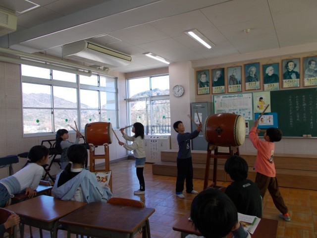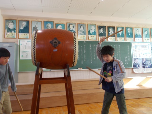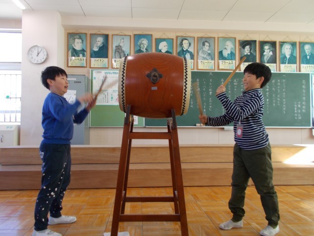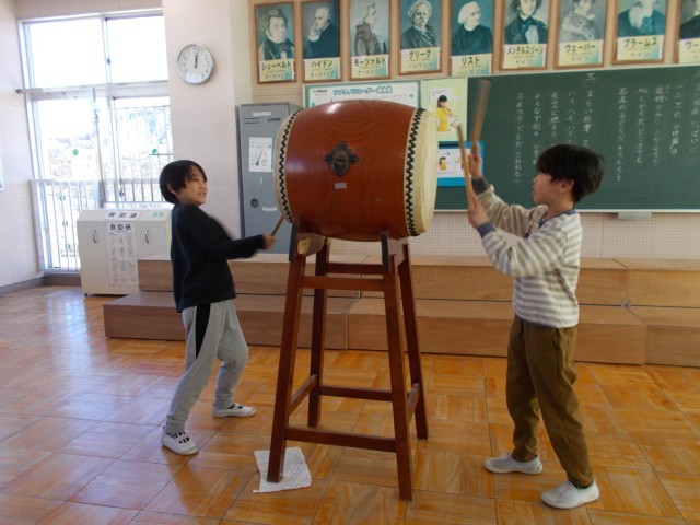 2学期最後の音楽は、音楽室でおこないました。「村まつり」の曲に合わせて順番にたいこをたたきました。習っている子もいてとても上手にたたくことができました。初めて和太鼓をたたく子や「本当のたいこは初めてだけど、太鼓の達人でやったことある!」と言う子もいて、楽しく取り組めました。
