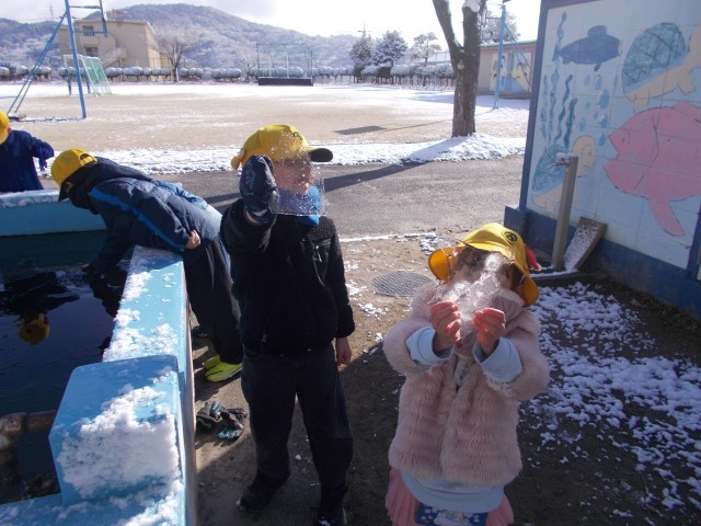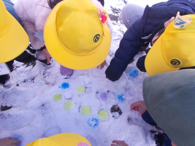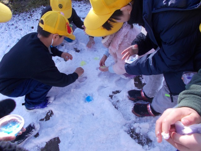 雪は積もった日は、朝から、観察池の氷を観察したり、雪に色水をまぜて雪遊びをしました。
