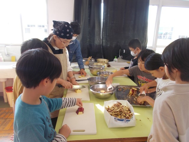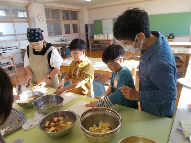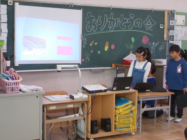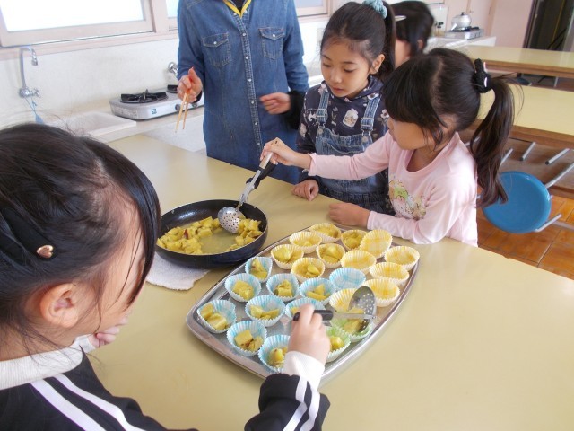 今日は、野菜畑ボランティアの方を招いて「ありがとうの会」を行いました。1・2時間目にさつまいものグラッセ作りをしました。みんなには、となりの図書室で勉強しながら、さつまいもの皮をむいたり、切ったり、カップにもりつけたり、手伝ってもらいました。「いいにおいがする~」「早く食べたい!」と言いながら楽しくお手伝いしてくれました。会は、教室で行い、野菜の成長記録、食レポ、歌、感謝の手紙、会食という流れで行いました。ボランティアの方にも喜んでいただけたのではと思います。さつまいものグラッセもみんなおかわりをして、すっかり売り切れました。