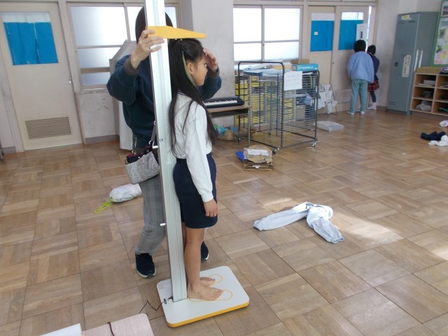 写真は身体測定の様子と書き初め大会の様子です。