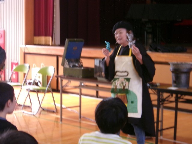 昭和の頃の町の様子や家、生活の様子のお話を聞いたり、その頃の道具を見たり説明を聞いたりしました。とても興味深いお話で、みんな質問をしたり、途中の休憩のときには近くにきて黒電話や蓄音機、洗濯板を触ったりしていました。