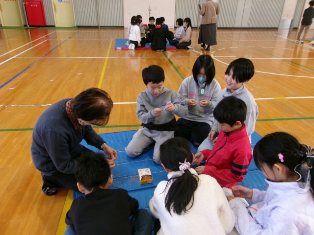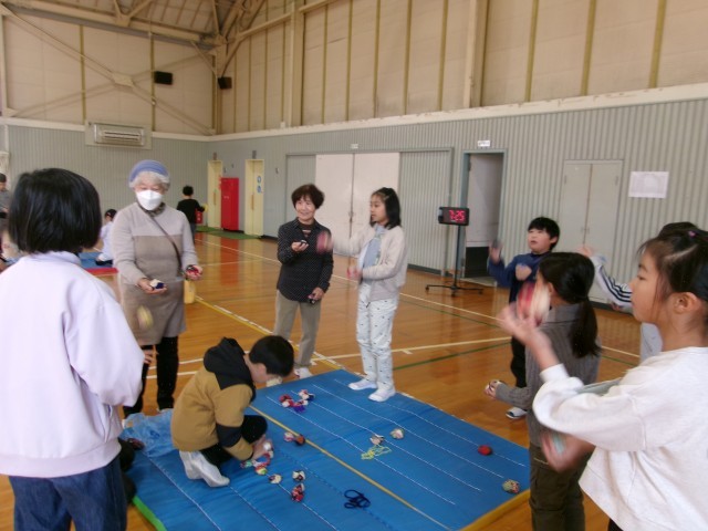 そのあとの交流会ではこまやあやとり、ゴム跳び、お手玉を教えていただきました。ゴム跳びでは輪ゴムをつなげて、長い紐状のものを作り、大繩のようにして遊んでいました。お手玉やこま、あやとりも最初は苦労しましたが、だんだん上達し、できると歓声があがっていました。