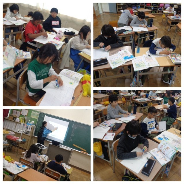 「円と球」の学習の中でコンパスの使い方を練習しています。今日は、円をたくさん描いて模様づくりをしました。円の中心をどこにして半径を何マス分にすればいいか、よく考えながらていねいに描いていきます。