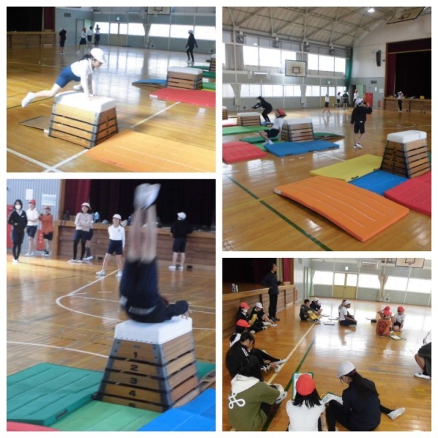 とび箱の練習に取り組んでいます。それぞれにめあてを決めて開脚飛びや台上前転などの技ができるようにがんばっています。