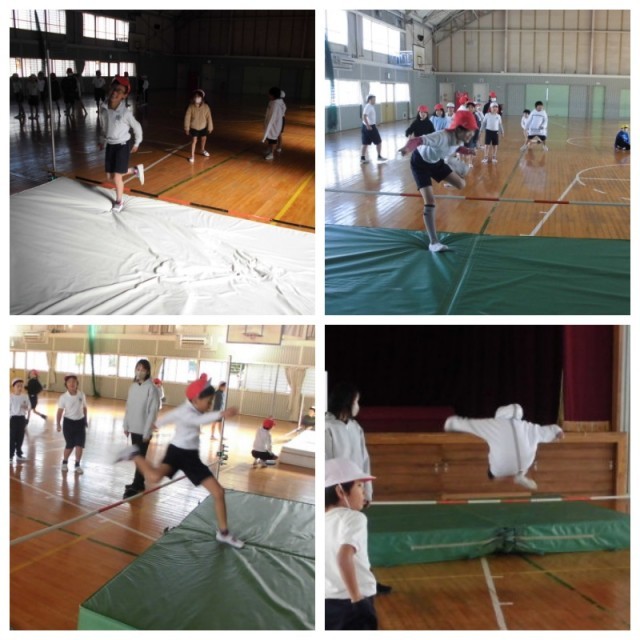 高跳びの練習を始めました。フワフワの分厚いマットを使いますが、またぐようにとぶ「はさみとび」で足から着地するように練習します。少しずつ慣れてきたようです。