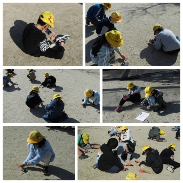 「太陽の光」の学習の中で、虫眼鏡を使って太陽の光を集める実験をしました。長い間、じーーーーーっと動かずに黒い紙に光を集めると、こげて煙が出ました。