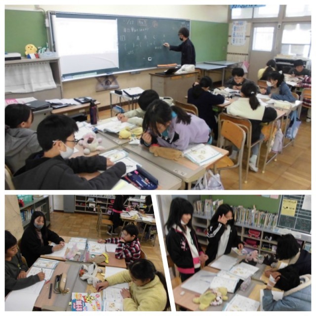 「単位量あたりの大きさ」の学習を始めました。今日は導入として、異なった人数の人がいる異なった広さの部屋の「混み具合」の比べ方を考えました。大人でもちょっと迷ってしまう難しい課題ですが、班で話し合いながら考えていました。