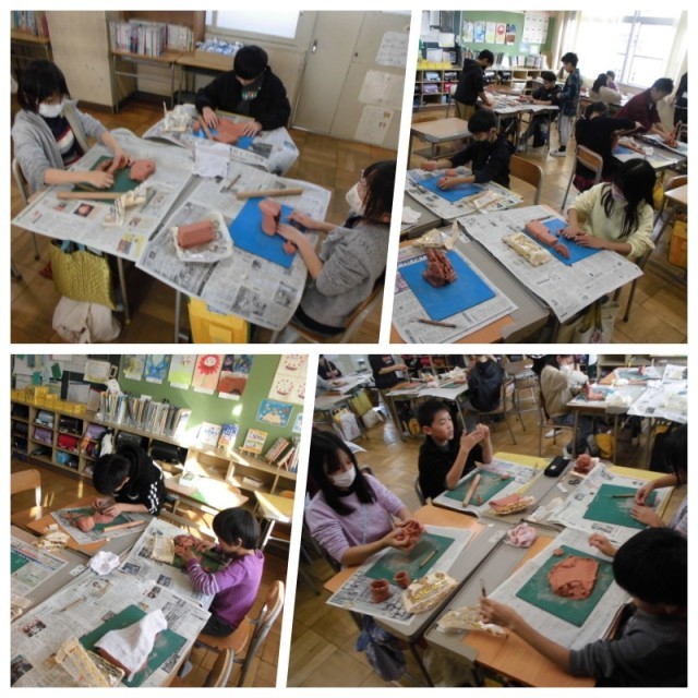 「ねん土の板を立ち上げて」をテーマに粘土の作品作りに取り組みました。今回は土粘土を使ったので手早く作り上げないと固まってしまいます。イメージした作品ができたでしょうか?