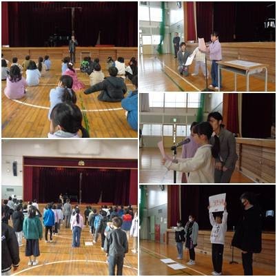 式の後には、「冬休み中に乗ってはいけない3つの車」の話を通して、子ども達に気を付けて欲しいことを伝えました。「3つの車」のお話は、お子さんに聞いていただき、ご家庭でも「冬休み中の安全」について話し合っていただければと思います。