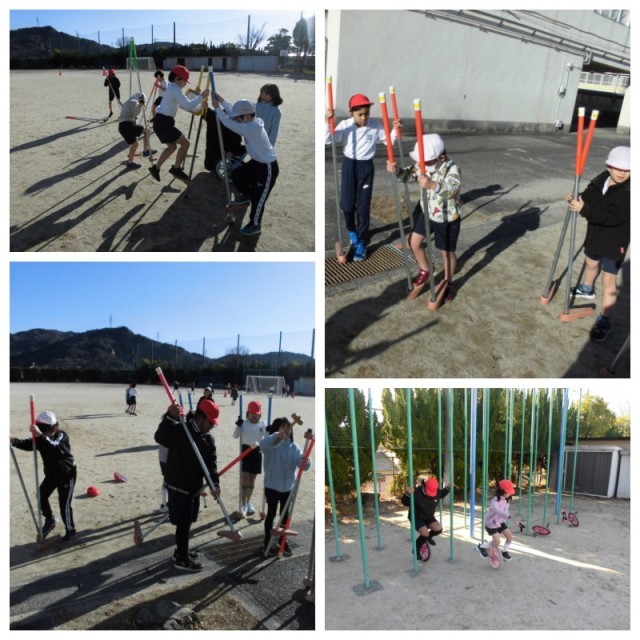 竹馬や一輪車にチャレンジしました。乗ることはなかなか難しいですが、お互いに支えあって練習しました。寒さに負けず放課にも練習するといいですね。
