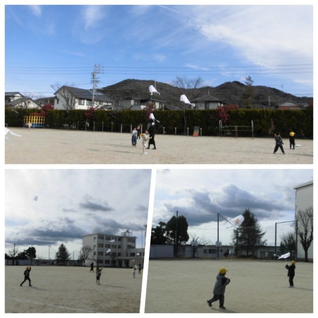 先週、絵を描いたたこをあげました。丁度いい具合に風が吹いていたのであっという間に簡単に上げることができました。しかし、お互いに糸がからんでしまうことが多くて大変でした。持ち帰ったら広いところで遊んでください。