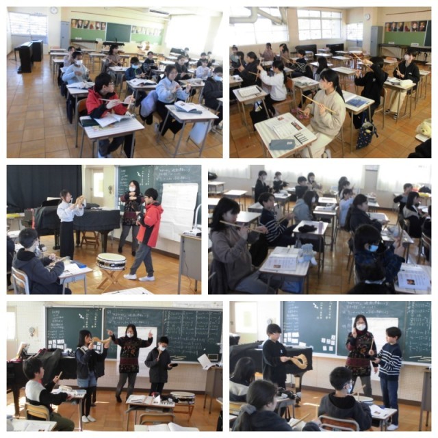 「こきりこ節」の合奏をしました。昔から教科書に載っている「マドノサンサモデデレケデン」といった不思議な歌詞とメロディーで印象的な曲ですね。楽器「こきりこ」はみんなの分はないのでたいこのばちで代用して、代表者が「かね」や「ささら」を順番に演奏しました。