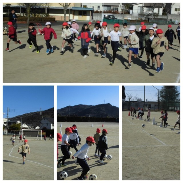「3分間走」に取り組んでいます。何回か試しているうちに自分のペースがわかってきたようで、しっかり3分間走り続けることができるようになってきました。後半はサッカーをしました。まっすぐ相手に向かってパスを出しています。