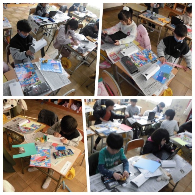 ロープウェイのようにピンと張ったひもを滑らせる作品「スルスルビューン」を作ります。ペンギンや新幹線、クラゲなど、いろいろなものがスルスルビューンと空を駆けます。出来上がりが楽しみです。