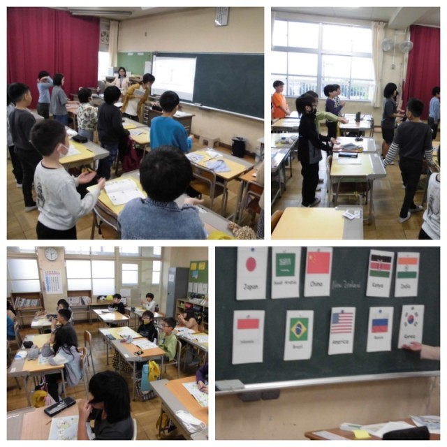4年生の外国語活動は「Unit 1 Hello, world! 世界のいろいろなことばであいさつをしよう」から始まります。世界地図や各国の国旗を見ながらそれぞれの国の言葉でのあいさつを学びました。