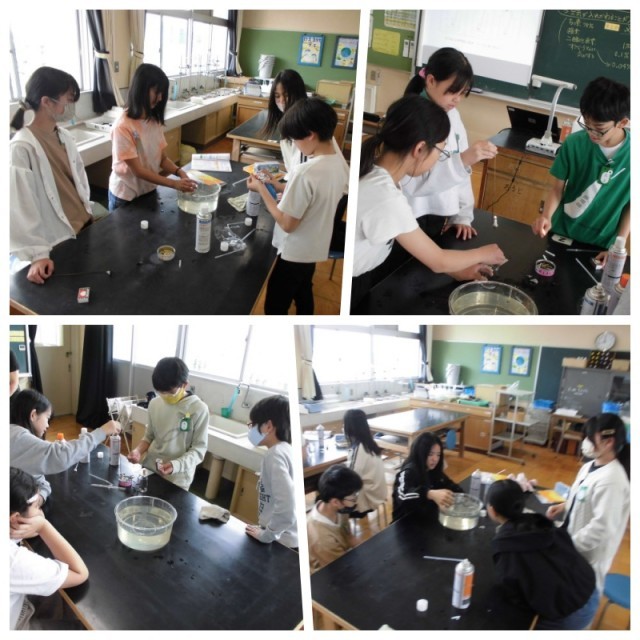 酸素、窒素、二酸化炭素をガラス瓶の中に満たして、そこに火のついたろうそくを入れると・・・「物の燃え方と空気」の学習の中でもとても印象的な実験ですね。班で協力しながら取り組みました。