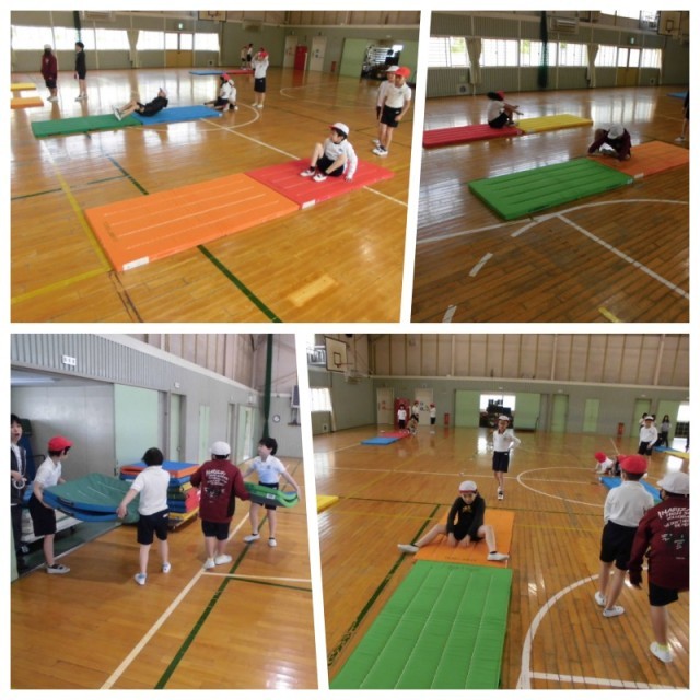 マット運動に取り組んでいます。前転、後転、開脚前転、開脚後転、それぞれめあてを決めて練習していきます。片付けも協力しながらサッとできました。