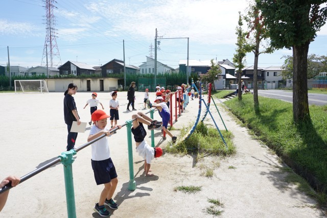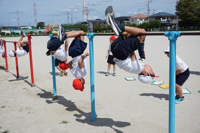 2年生の体育の学習です。今日は鉄棒のいろいろな技に挑戦しました。つばめ、豚の丸焼き、こうもりなど自分のできる技を見合ったり、新しい技を教え合ったりしました。