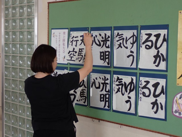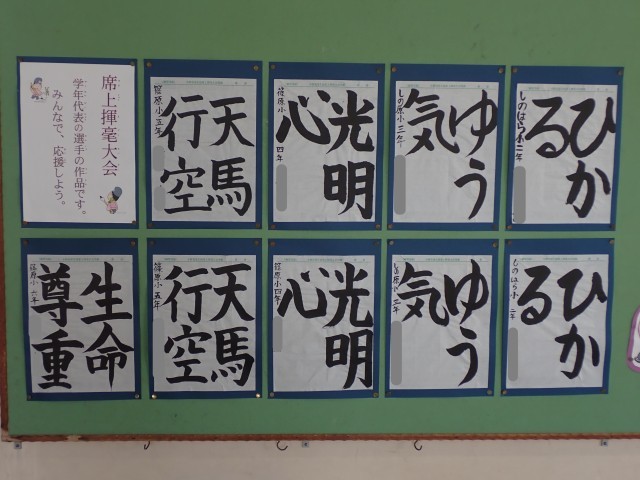 春日井市で毎年行われる「県下児童・生徒席上揮毫大会」に向けての練習作品です。9月初めに校内選考会を行い、篠原小学校代表となった9名の作品です。10月末の大会に向けて、家で練習を重ね、毎週担当の先生へ提出します。