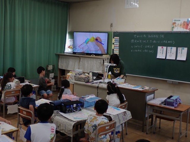 図工の学習です。レオ・レオニさん作の「せかい いち おおきな うち」というお話を聞いて、登場する「かたつむり」を表現していきます。