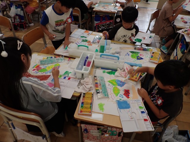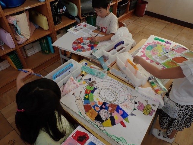 この時間は、かたつむりの殻を、絵の具を使って丁寧にぬることが課題でした。筆の使い方を確認した後に、自分のイメージに合う色でぬり始めました。かたつむりの殻は細かく分かれているので、いろいろな色をつくりぬっていました。素敵なお家が出来上がりそうです。