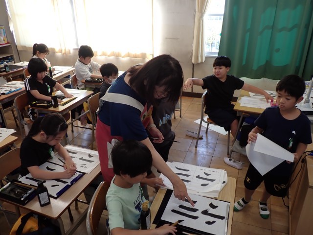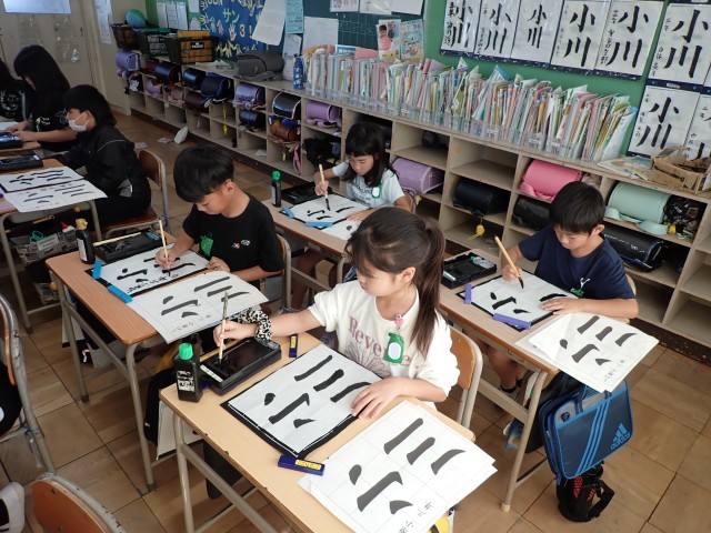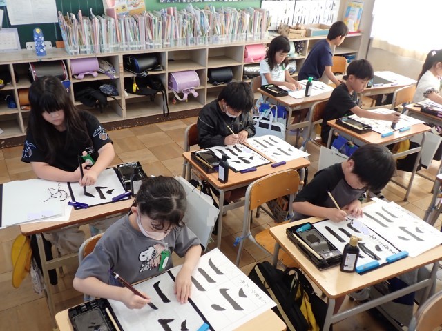 良い姿勢や筆の持ち方、これまでに学習した点画の筆遣いなどを意識して、自分の目標の達成に向けて頑張っていました。名前も丁寧に書きました。