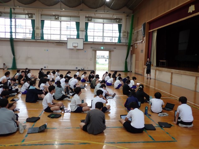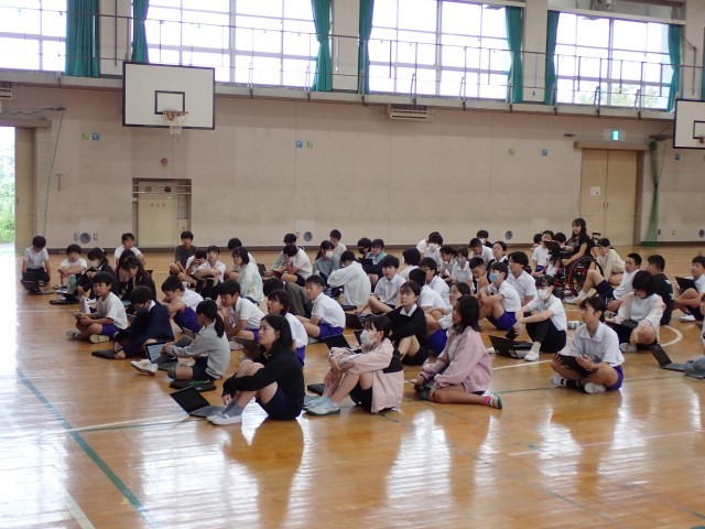 まずは体育館に集まり、修学旅行の目的・心構え・行程・その際に気を付けることなどについて、学年主任の先生からの話を聞きました。