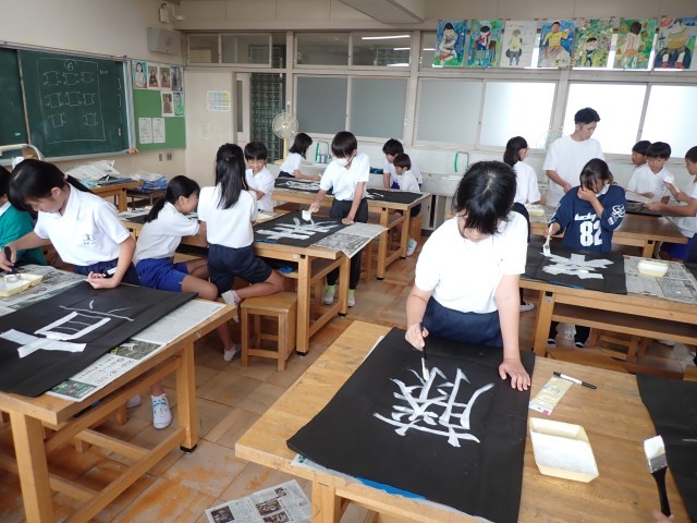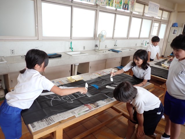 その準備として、本番で着用する法被の背中に、専用塗料で大きく1文字を書きました。