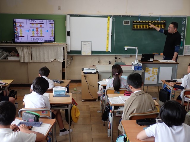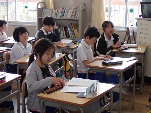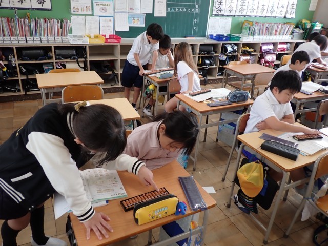 4年生では、2.47+3.63のような小数の計算の仕方や1億を超える大きな数の表し方を考えたり、たし算とひき算の混じった積み算に取り組んだりしました。教科書を読んだり、教科担任の説明を聞いたり、友だちと教え合ったりしながら、「そろばん」を使って計算することに少しずつ慣れていきました。