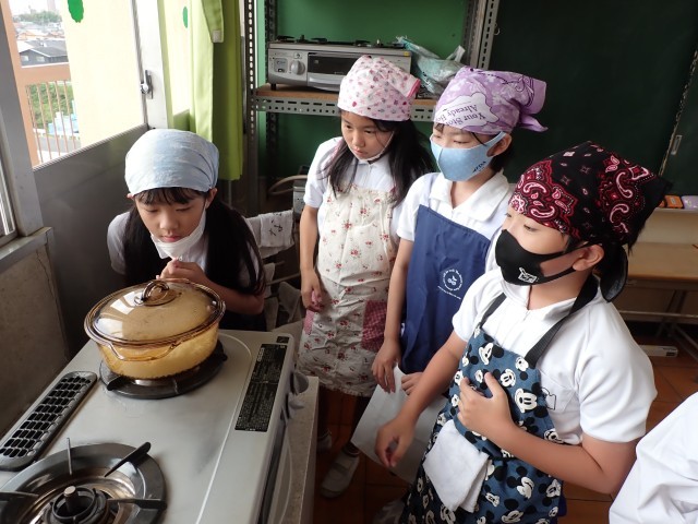 鍋でご飯を炊いて、お米の様子を観察しました 5年生