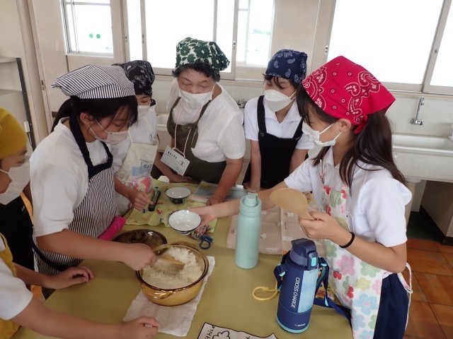 家庭科「食べて元気!ご飯とみそ汁」の学習です。毎日の食事を振り返ったり、伝統的な日常食のご飯やみそ汁を調理したりすることを通して、調理の基礎的な知識や技能を身に付けたり、食事の役割や栄養バランスを考えたりします。