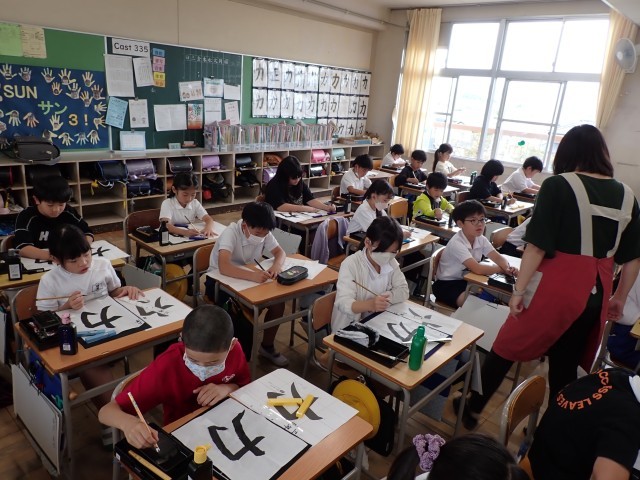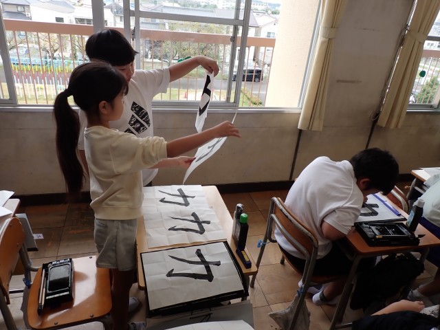 練習後は、書いた字を見せ合い、自分が良いと思う順に2枚(名前の練習用と清書用)を選びました。そして、小筆の持ち方や扱い方、学年や名前を書く位置や字の大きさを確認してから、名前を丁寧に書いて作品を仕上げました。